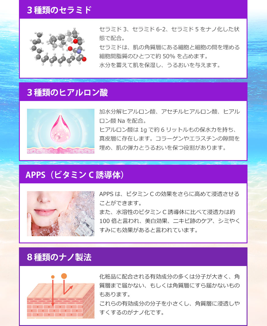 通常のヒアルロン酸を超低分子加工し、従来の約2倍の浸透率を実現したヒアルロン酸です。従来のヒアルロン酸だけでは保湿が万全ではないという見方から開発され、高い浸透力と保湿力でもって潤いすべすべな肌を維持します。 |