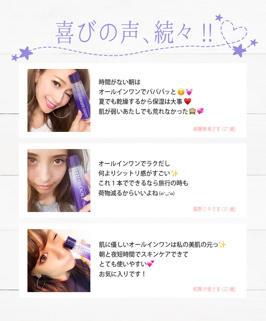 とにかく簡単に肌ケア。洗顔後はこれ1本。3種類のヒアルロン酸を配合して保湿はばっちり。ビタミンC誘導体でクリアな肌へと導きます。ライトな化粧水タイプなのでベタツキが気になる方におススメです。 |